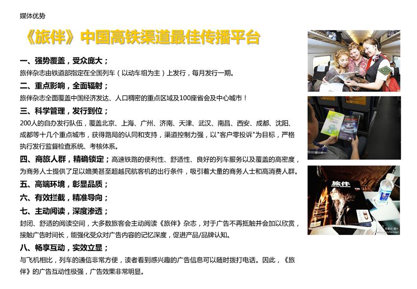 《旅伴》特定的阅读环境,实现广告传播的高渗透效应。阅读舒适度最高、阅读到达率最佳,火车车厢内可供阅读的媒体极少,媒体的可读性很差,在漫长的旅途中,为了消磨时间,乘客无论被动还是主动,往往都会重复阅读《旅伴》杂志。