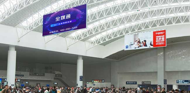 2、媒体悬挂在候车大厅正上方,媒体面积大且有双面,候车人群在候车大厅走动到任何位置都可看见,无死角覆盖。