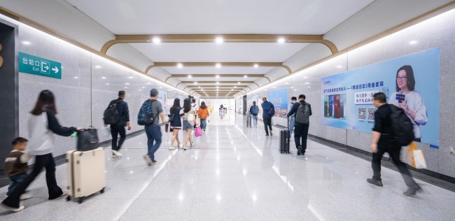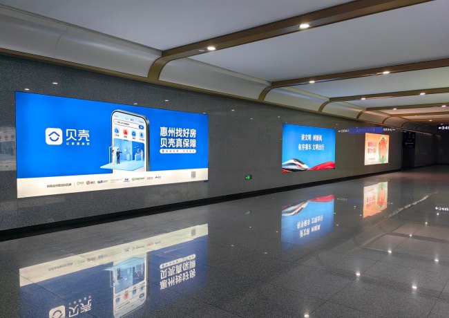 惠州南站出站通道两侧墙面灯箱广告7块大型灯箱沿通道两侧分布,套装组合发布既可在有限预算内实现重点覆盖,也可通过多组采购形成更密集的展示阵列,增强了品牌形象的展示气势。墙面灯箱在通道环境中具有视觉上的突出性,较大的展示面积确保了广告内容在有效距离内的清晰辨识。这种连续设置的灯箱组能够在旅客出站过程中形成持续的视觉引导,使品牌信息得以在相对封闭的通道空间内实现有效传递。