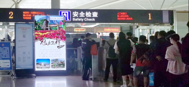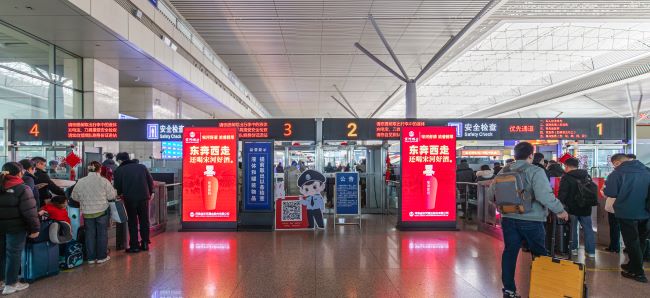 郑州东站进站安检口立地LED大屏广告10台立地竖屏在主要进站口形成规模化媒体阵列,构建了统一的品牌视觉防线。LED动态屏幕相比静态广告更具视觉吸引力。大屏分布于五个进站口的安检仪两侧,是旅客进入候车厅的唯一必经之路,屏幕内容能无规避地进入其视野核心区,实现近身距离的强制曝光。安检口大屏干扰度低,形成了品牌独占的沟通空间。LED刷屏机支持全屏静态、上视频下静态分屏等多种发布形式。灵活选择最具冲击力或信息承载力的沟通方式,提升广告表达效率。