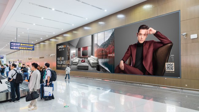 青岛胶东机场到达行李厅墙面大型灯箱广告巨大的广告画面几乎占据了旅客视野中的一整面墙,在行李厅这个功能明确、视觉干扰相对较少的空间中,能够自然形成视觉焦点,产生强烈的视觉冲击力与记忆点。旅客在行李转盘旁固定区域等候,与墙面广告的物理距离非常近,通常仅数米至十余米。这种近距离关系使得广告画面的细节清晰可见,视觉包围感强,容易营造沉浸式的品牌体验,