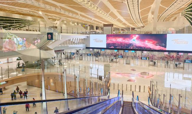广州机场T3国内出发安检口上方3D大屏广告两块尺寸巨大的LED屏幕构成的套装,位于安检通道正上方是旅客排队、等候时 自然抬头的视线焦点区域,形成了近乎覆盖整个安检区域的“视觉天幕”。两块总面积近800平方米的屏幕并列,形成了震撼的 双层视觉阵列。结合3D视觉技术,能够呈现具有纵深感和冲击力的动态内容,在挑高空间内创造出小型“视觉奇观”。