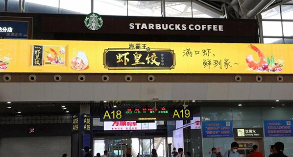 旅客们一进检票口就可以看到海霸王虾皇饺广告