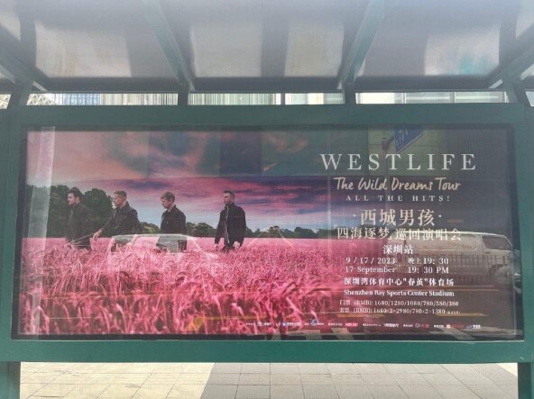 深圳公交候车亭广告2周起做,支持短期亦可长期发布广告,是演唱会、影视剧等文化活动宣传的不二之选。以粉色麦田为背景的WESTLIFE西城男孩深圳巡回演唱会宣传海报上刊深圳大街小巷的公交候车亭广告。第一户外小编通过此次演唱会广告案例带大家了解下深圳候车亭灯箱广告。