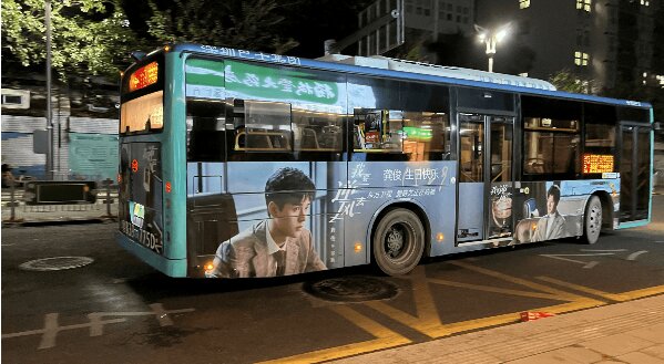 不得不说这次演员龚俊深圳公交车应援广告的设计真的值得参考,不仅用最大篇幅的车身两侧分别展示了人物剧照,选用的蓝灰色背景极具故事感引人入胜。选择电视剧热播期间精心选择深圳最热门公交线路宣传,同时在恰逢演员生日的11月送上生日祝福。